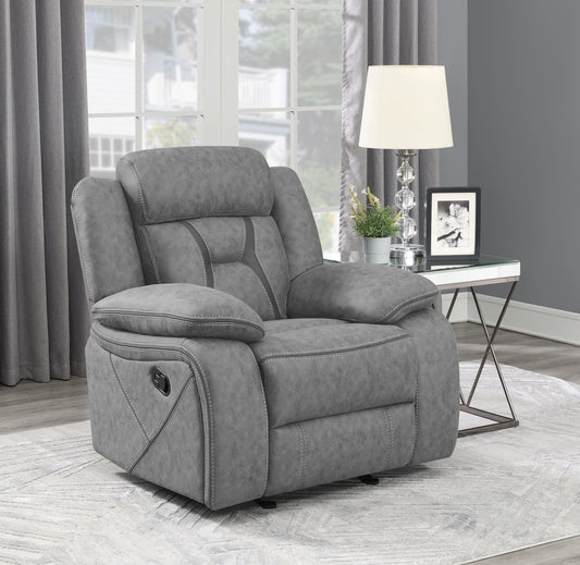 • Motion sofa collection upholstered in grey performance-grade coated microfiber
