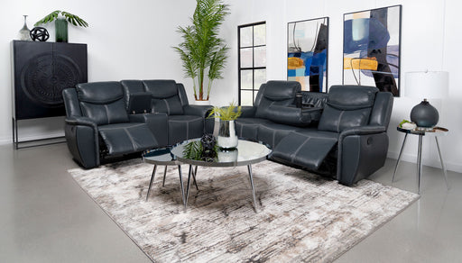 CoasterBold black leatherette upholstery offers the look of luxurious leather with easy-care maintenance as the three-piece motion sofa set is versatile a...