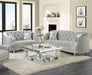 Classic and elegant, this two-piece living room set looks great with a chic aesthetic. Featuring high rolled and arms and button tufting, the traditional silhouettes of the sofa and loveseat emit an elegant aura. Perfect for a classic motif, the grey fabric upholstery adds texture to any space. A decorative nail head trim lines the cushions and subtle crystal details give this stunning piece all-over glam. Dress up any space with the smooth features and neutral hues.