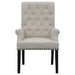 Designed for both luxury and support, this arm chair brings an elegant presence to any dining space. Its button-tufted high back and rolled top lend a timeless aesthetic, while the addition of padded armrests enhances comfort. Hand-applied nailhead trim offers a sophisticated finishing touch, complementing the chair’s tailored silhouette. A generously padded seat and sturdy legs ensure both durability and long-lasting comfort, making it a stunning choice for formal and everyday dining alike.