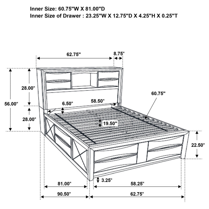Transform your bedroom with this sophisticated storage bedroom set that combines timeless style and practical function. Finished in sleek black, the platform bed features four drawers in the footboard and hidden compartments behind drop-down doors on the headboard and side rails. The bookcase headboard includes four drawers and a center shelf for accessible storage. Complementary case pieces echo the look with chambered drawer fronts and brushed nickel hardware, creating a refined and cohesive space.