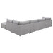 • Modular sectional sofa with soft grey upholstery offers modern style and plush comfort