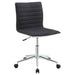 Ergonomic excellence finds a modular profile and produces a tasteful chair for contemporary motifs. This office chair keeps it simple and stylish. Covered in sleek black fabric, its slender frame offers gently contoured shaping to fit seating positions. Chrome accents add a sleek, contrasting look. Adjust seating heights according to preferences, and move about easily with a spoke style caster wheel base.