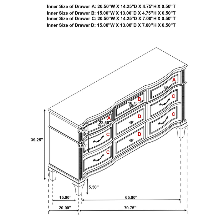 A silver oak finish creates an elegant touch to this glam nine-drawer dresser. Hexagon-shaped knobs and drop bail handles appointed with pearl accents adorn each of the nine spacious drawers for a luxurious look and feel. Keep delicate essentials organized within the grey felt-lined top drawers and garments in the deep bottom drawers. Across the dresser front is a curved facade that sweeps through the drawer fronts and ends at two sparkling column panels. Charming wood molding details along the top and bottom, along with intricate trim, offer a classical flair.
