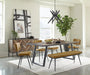 • Retro charm is on full display in a five-piece casual dining set with a rectangular wood and iron dining table, four side chairs and bench with channeled tufting upholstery