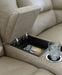 Experience ultimate comfort with this power reclining sectional. Generously cushioned with plush bustle back styling and pillow top track arms, it's wrapped in a richly neutral upholstery that’s oh-so soft. Jumbo stitching gives the sectional added definition. The one-touch power control and USB charging take the pleasure of reclining to a higher level, while a console with storage and dual cup holders marries function with great form.