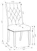 • Beige fabric chairs with button-tufted backs and decorative trim details