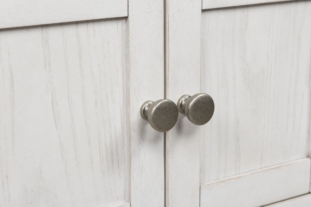 Details Includes dining table top and base, Made with rubberwood solids, ash veneer and MDF substrates, Antiqued white finish with wood grain texture, Two 10-bottle wine storage shelves (1 reversible), Lower door cabinet accessible from both sides, 2 pass-through drawer bins, Assembly required
