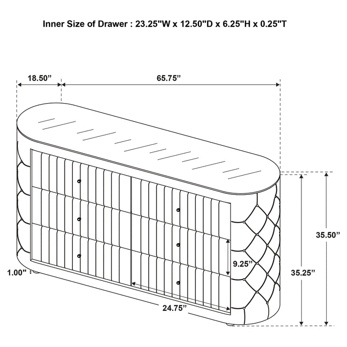 • Coordinating case pieces feature velvet upholstery with vertical stitching and crystal accents